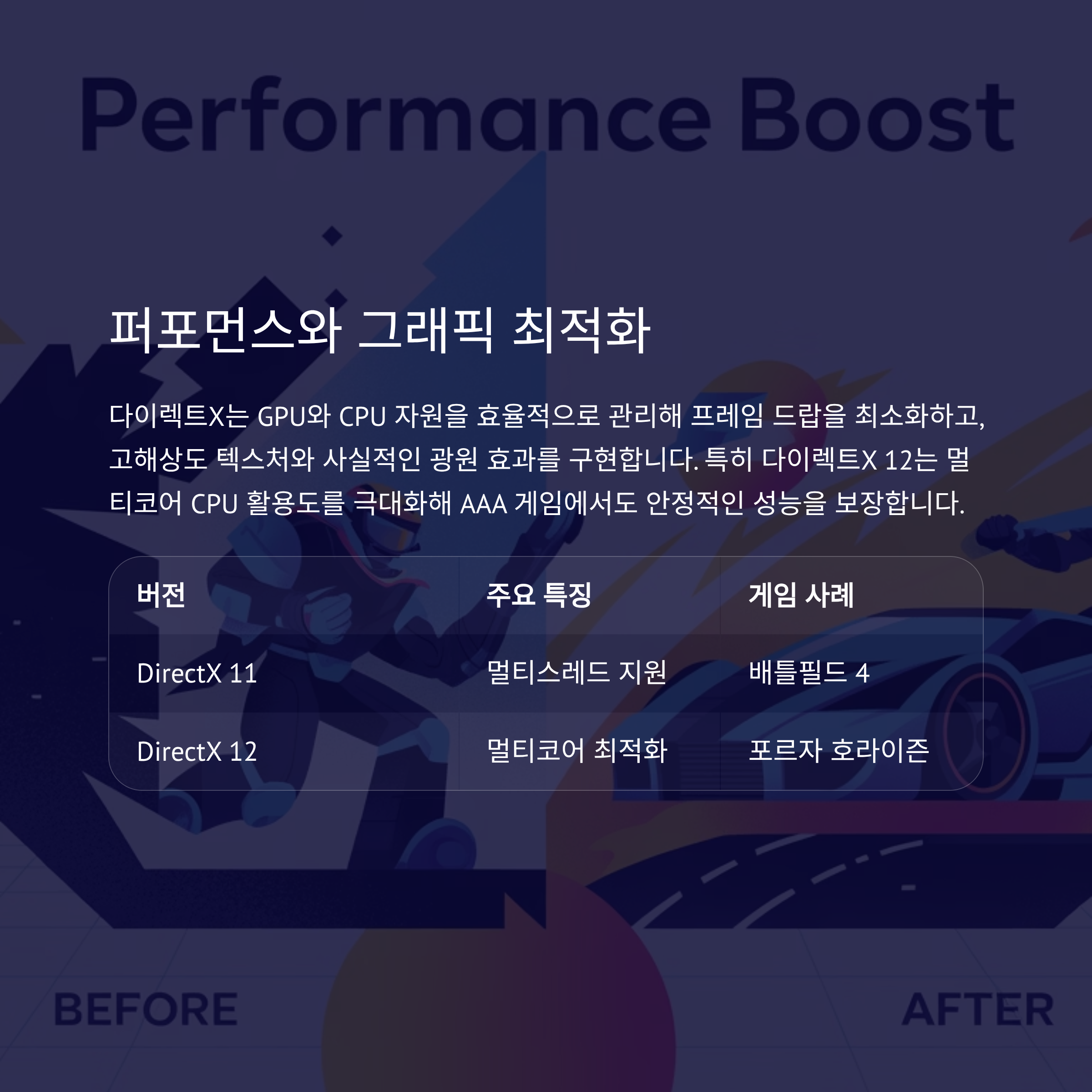 | DirectX 12 | 로우레벨 API, 멀티코어 최적화 | 포르자 호라이즌 시리즈 |