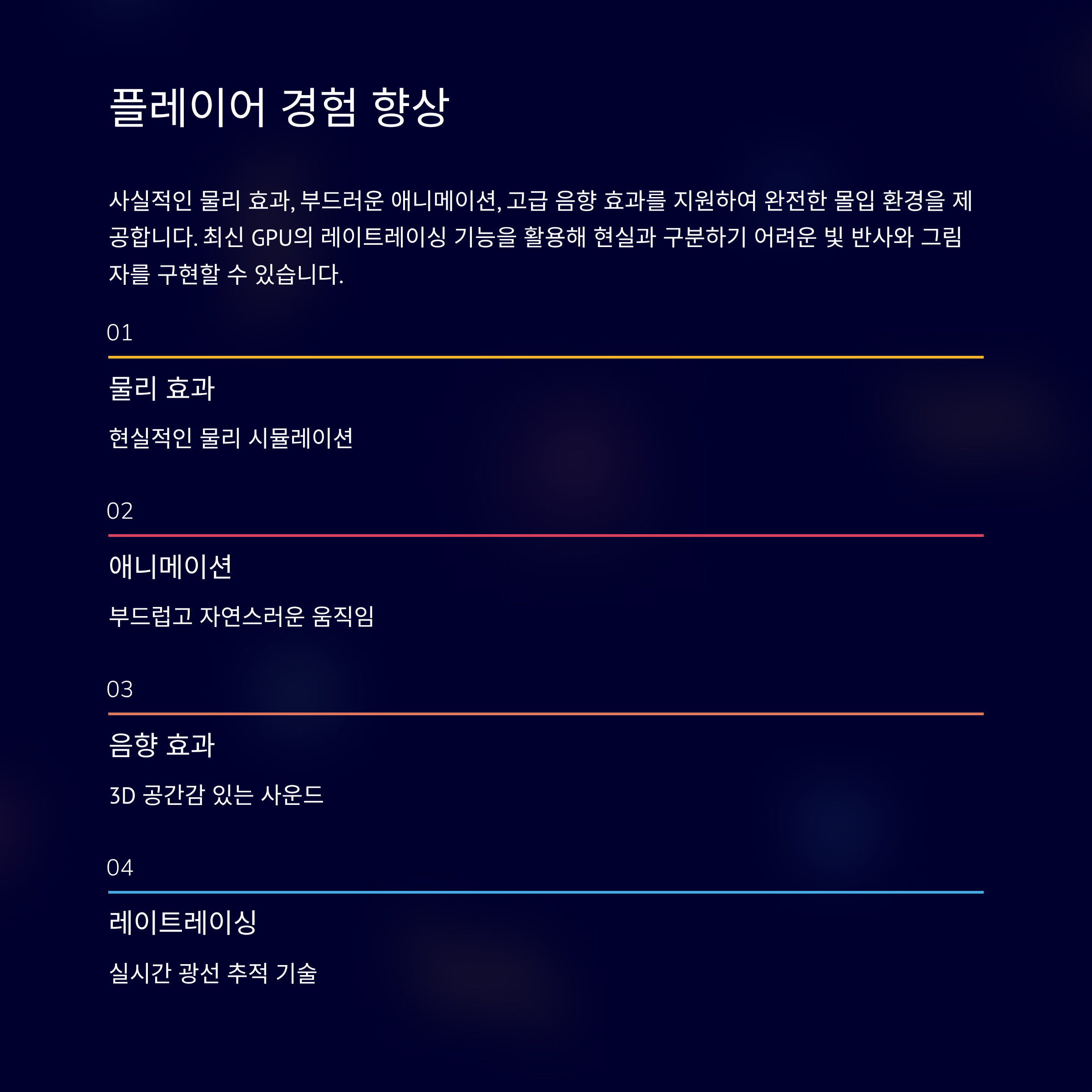 게임을 즐기는 최종 사용자는 그래픽의 화려함뿐 아니라, 얼마나 끊김 없이 몰입할 수 있는지가 중요합니다. 다이렉트X는 사실적인 물리 효과, 부드러운 애니메이션, 고급 음향 효과 등을 지원하여 플레이어가 완전히 몰입할 수 있는 환경을 제공합니다. 특히 최신 GPU의 레이트레이싱 기능을 활용해 현실과 구분하기 어려운 빛 반사와 그림자를 구현할 수 있어, 게임 세계가 한층 더 생생하게 다가옵니다.