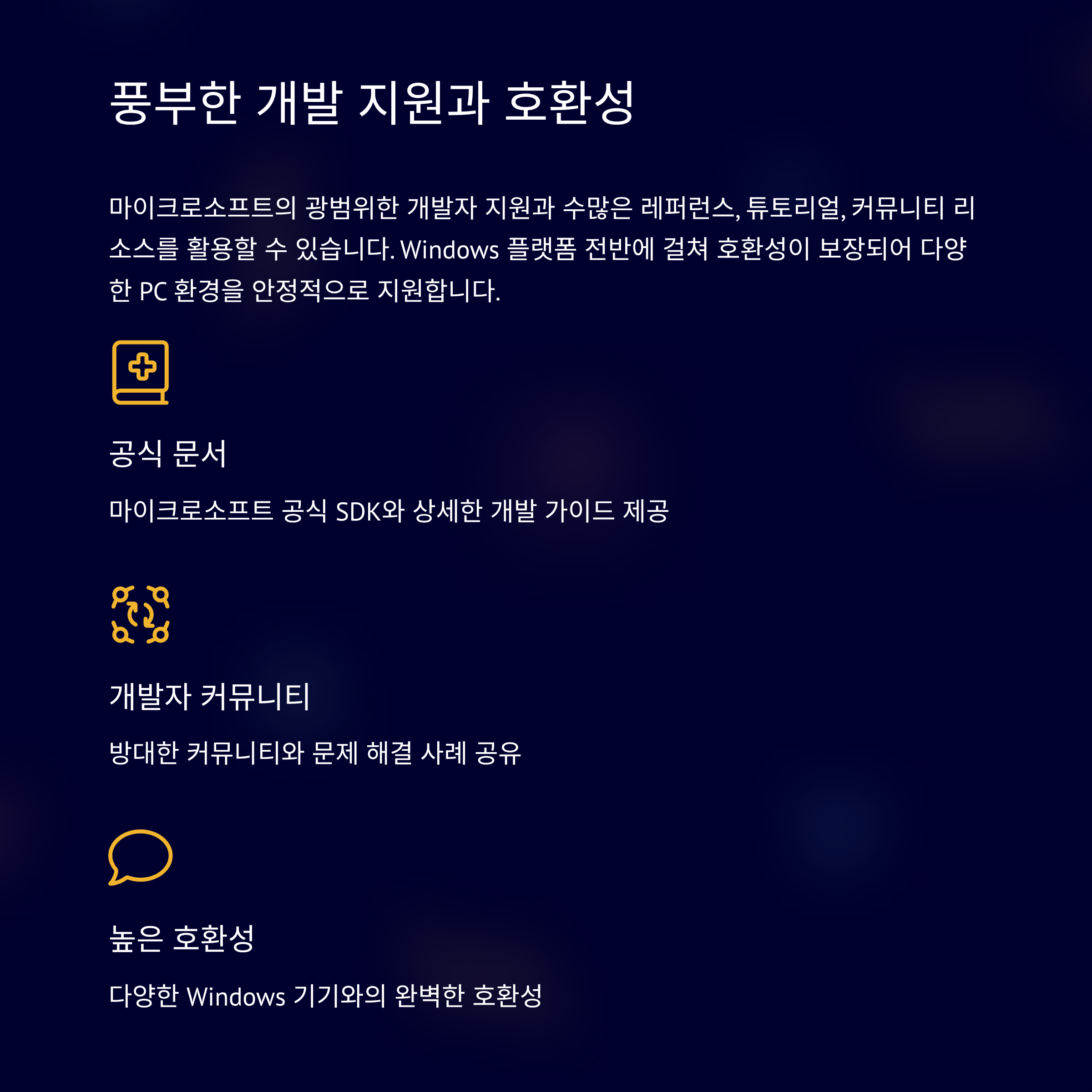 다이렉트X는 단순히 성능만 뛰어난 게 아닙니다. 마이크로소프트의 광범위한 개발자 지원과 함께, 수많은 레퍼런스와 튜토리얼, 그리고 커뮤니티 리소스를 활용할 수 있다는 장점이 있습니다. 또, Windows 플랫폼 전반에 걸쳐 호환성이 보장되기 때문에 개발자 입장에서는 안정적으로 다양한 PC 환경을 지원할 수 있죠.