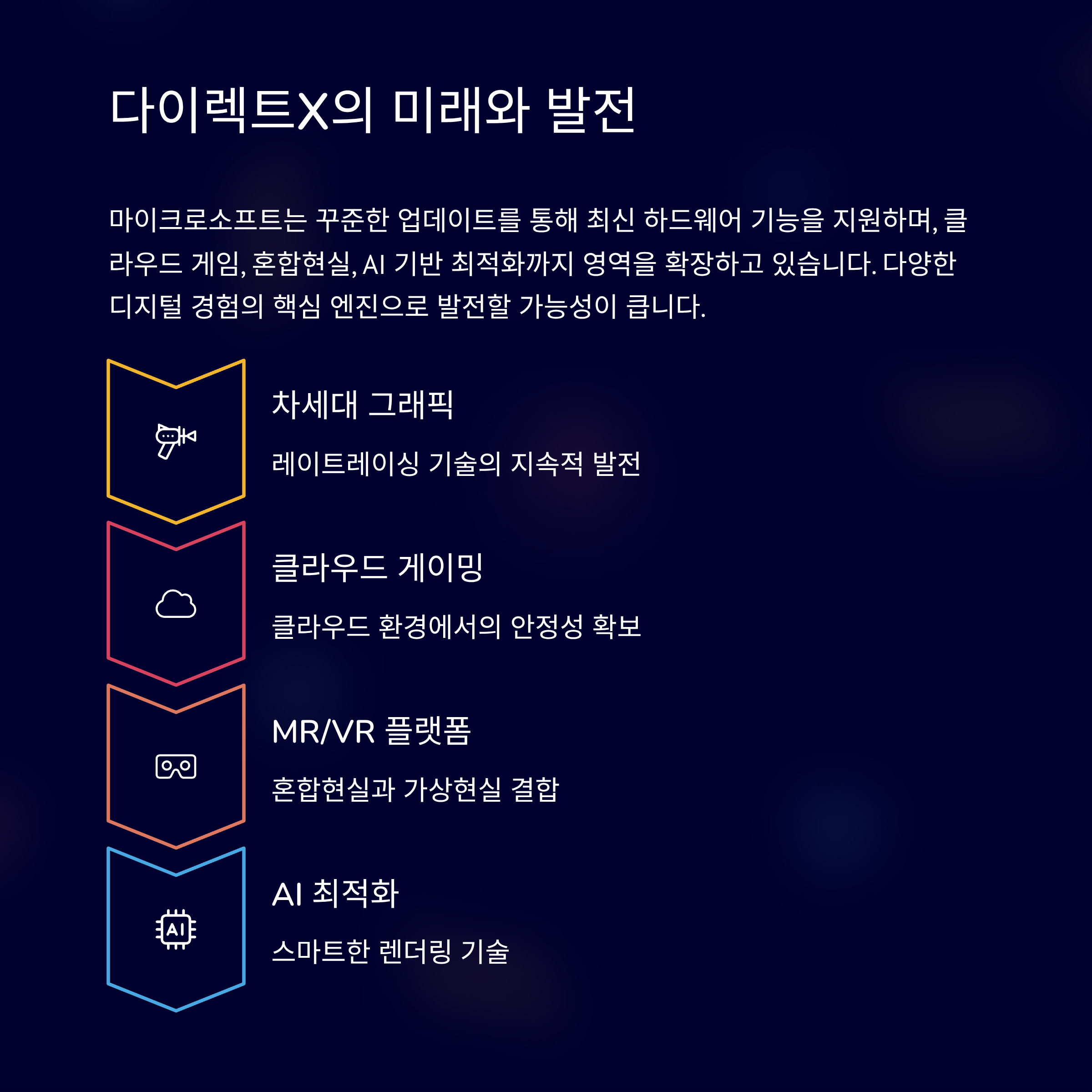 다이렉트X는 단순히 현재에 머무르는 기술이 아닙니다. 마이크로소프트는 꾸준히 업데이트를 통해 최신 하드웨어 기능을 지원하며, 클라우드 게임, 혼합현실(MR), AI 기반 최적화까지 영역을 넓혀가고 있습니다. 앞으로도 다이렉트X는 게임 그래픽뿐 아니라 다양한 디지털 경험의 핵심 엔진으로 자리잡을 가능성이 큽니다.