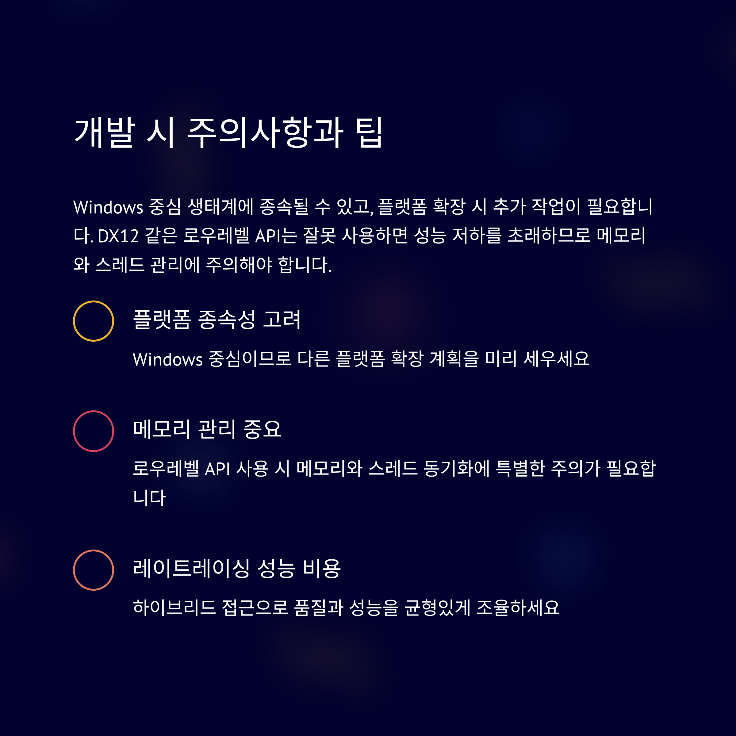 Windows 중심 생태계에 종속될 수 있고, 플랫폼 확장을 계획하면 추가 작업이 필요합니다. 또한 DX12 같은 로우레벨 API는 잘못 사용하면 오히려 성능 저하를 초래하므로 메모리·스레드 관리와 동기화에 주의를 기울여야 합니다.