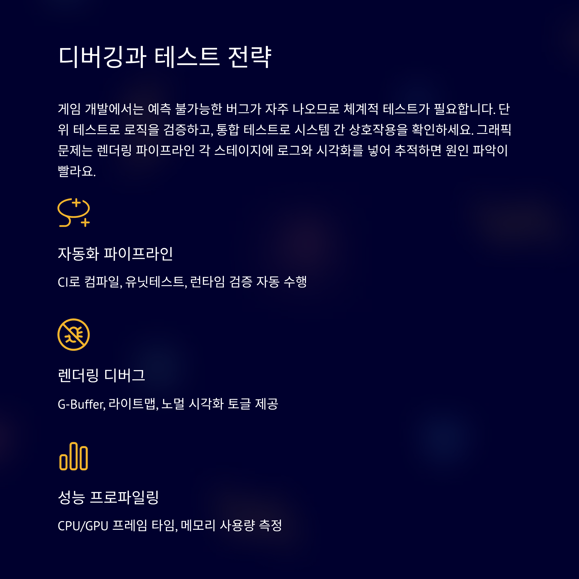 게임 개발에서는 예측 불가능한 버그가 자주 나오므로 체계적 테스트가 필요합니다. 단위 테스트(Unit Test)로 로직을 검증하고, 통합 테스트(Integration Test)로 시스템 간 상호작용을 확인하세요. 그래픽 관련 문제는 렌더링 파이프라인의 각 스테이지에 로그와 시각화(와이어프레임, G-Buffer 출력)를 넣어 추적하면 원인 파악이 빠릅니다.