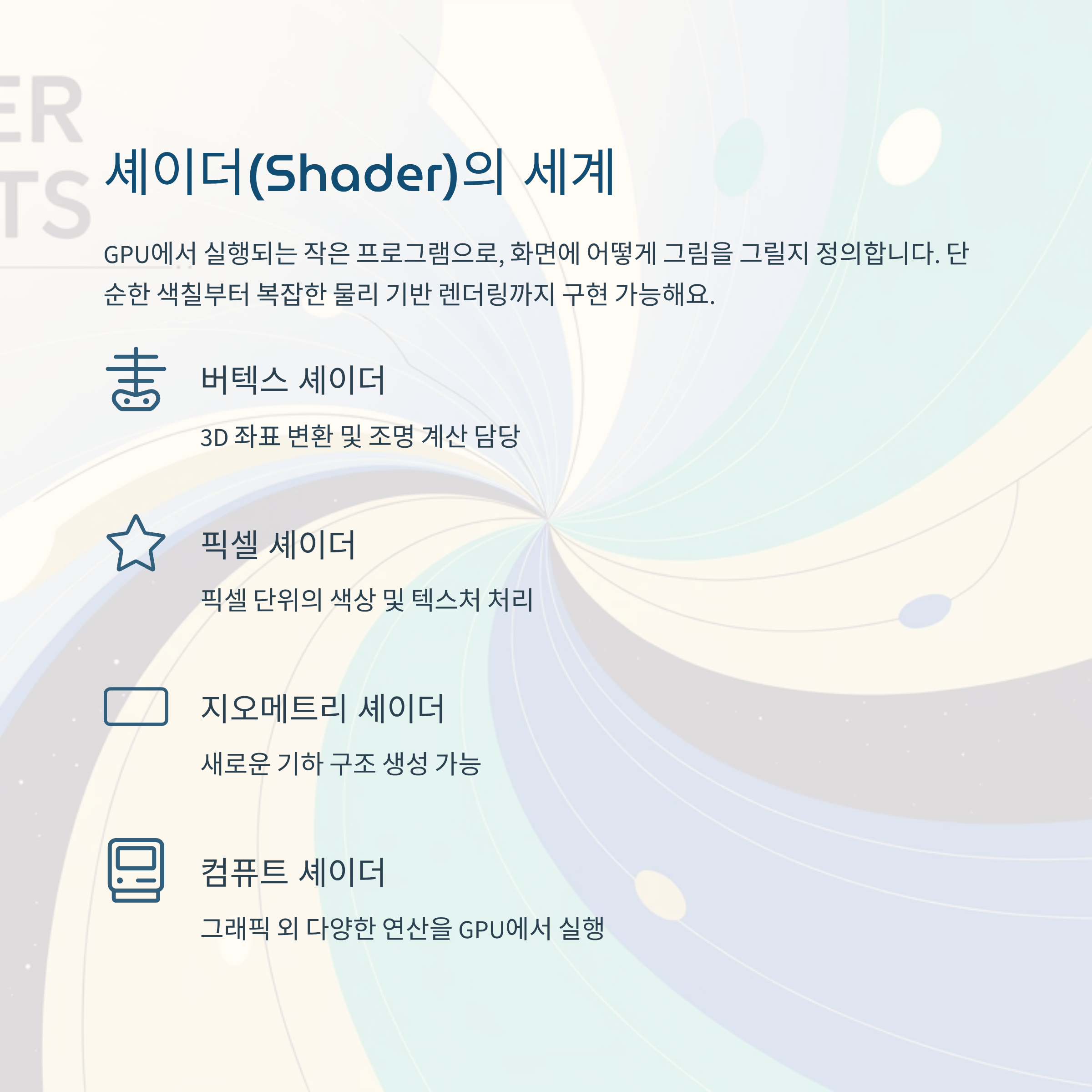 - 픽셀 셰이더: 픽셀 단위의 색상 및 텍스처 처리