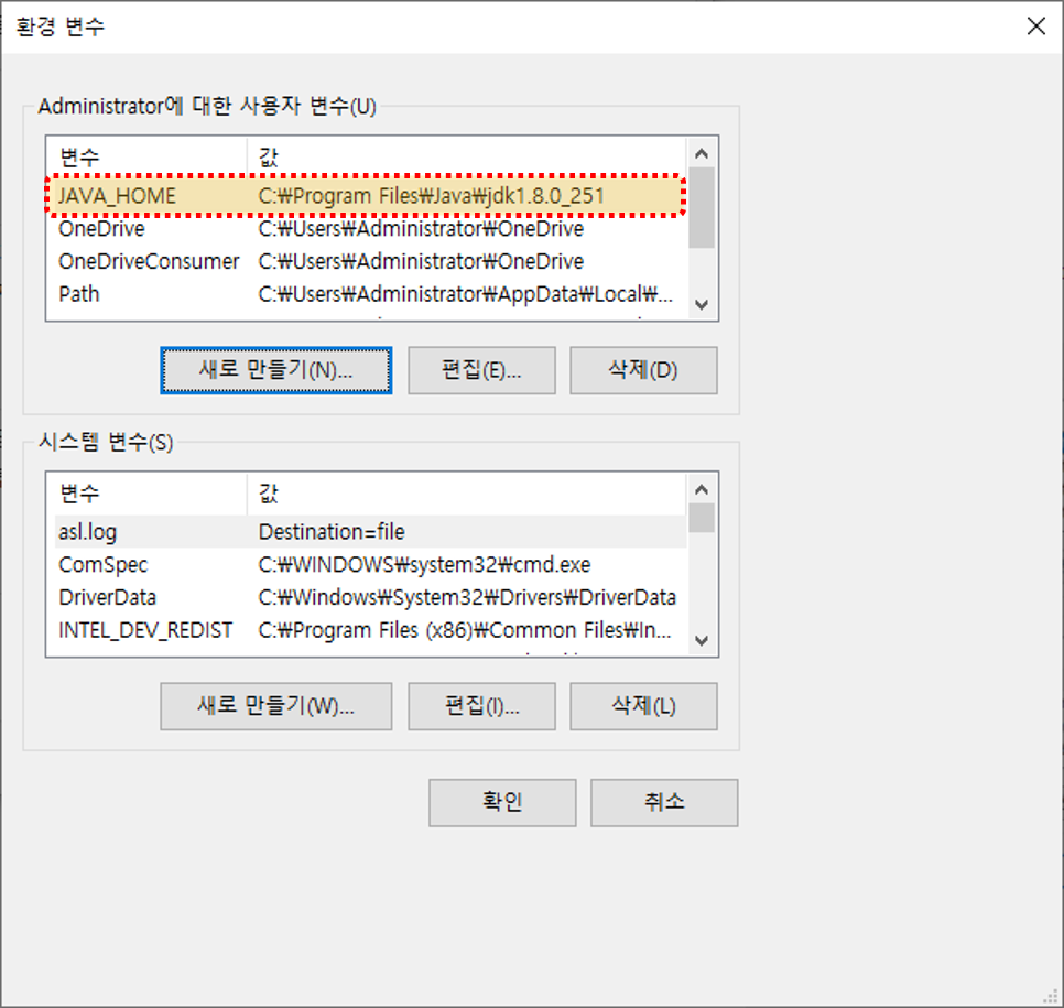 그림과 같이 [ 새로 만들기>변수이름: JAVA_HOME > 변수값:JDK설치폴더 경로 를 입력 ] 후 확인을 클릭합니다.