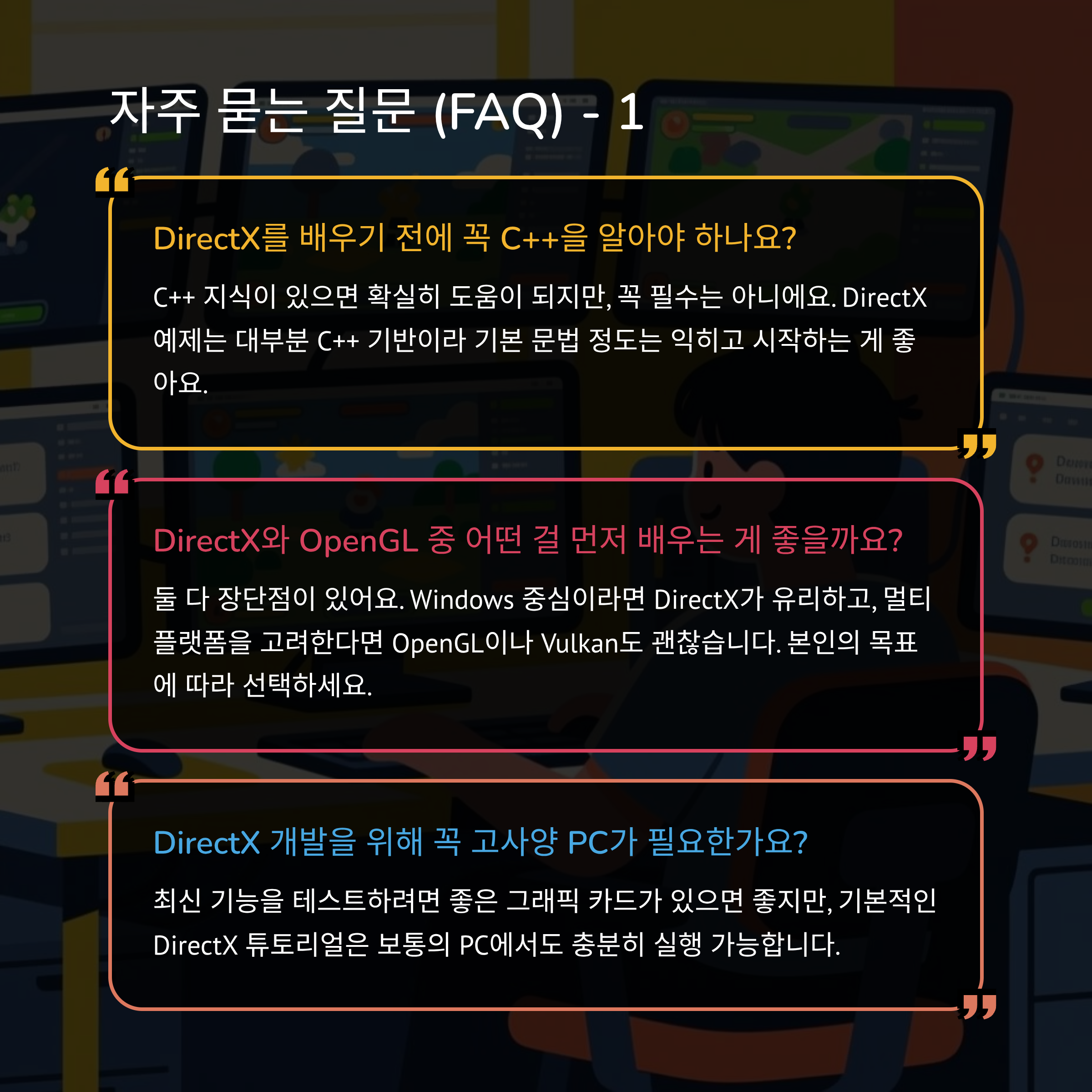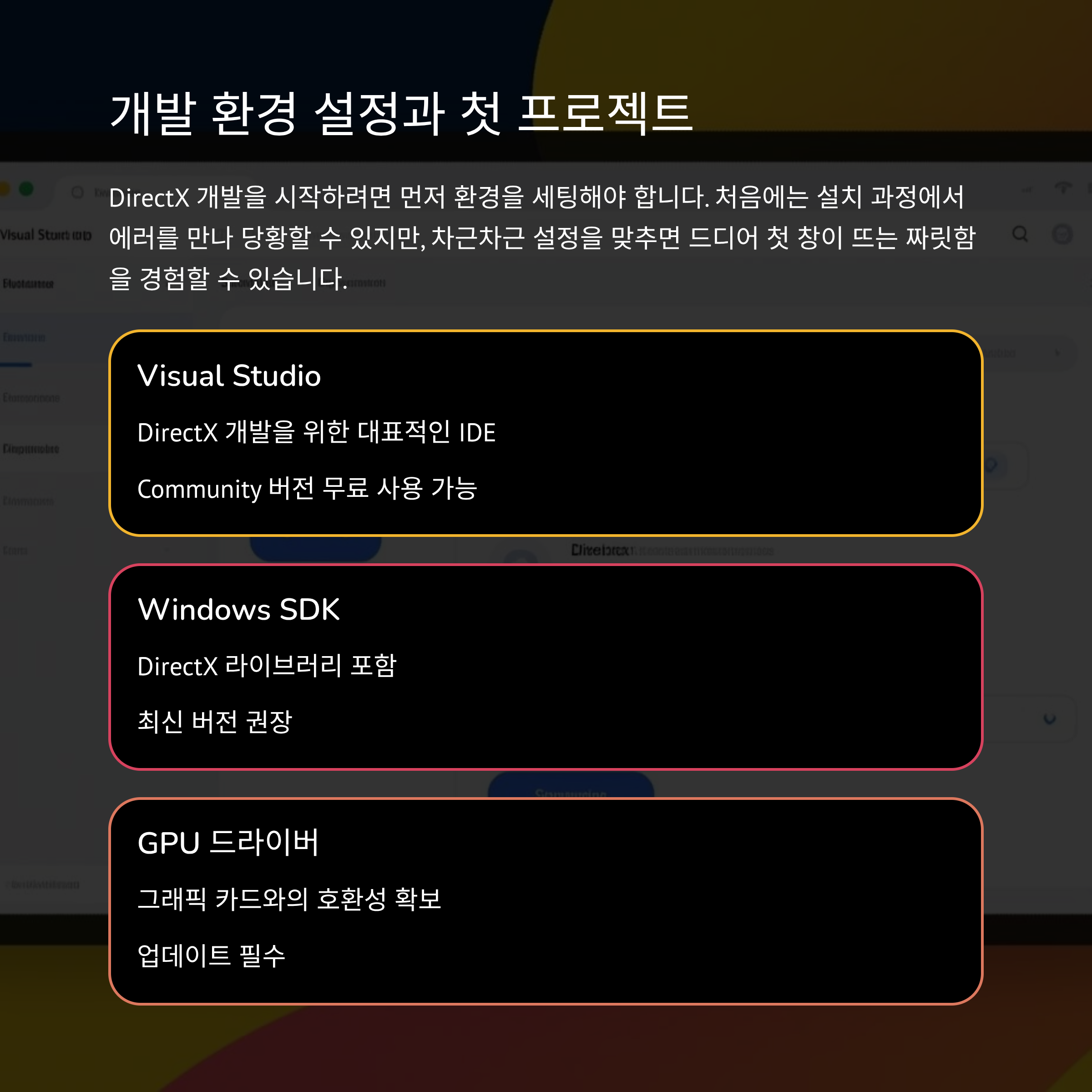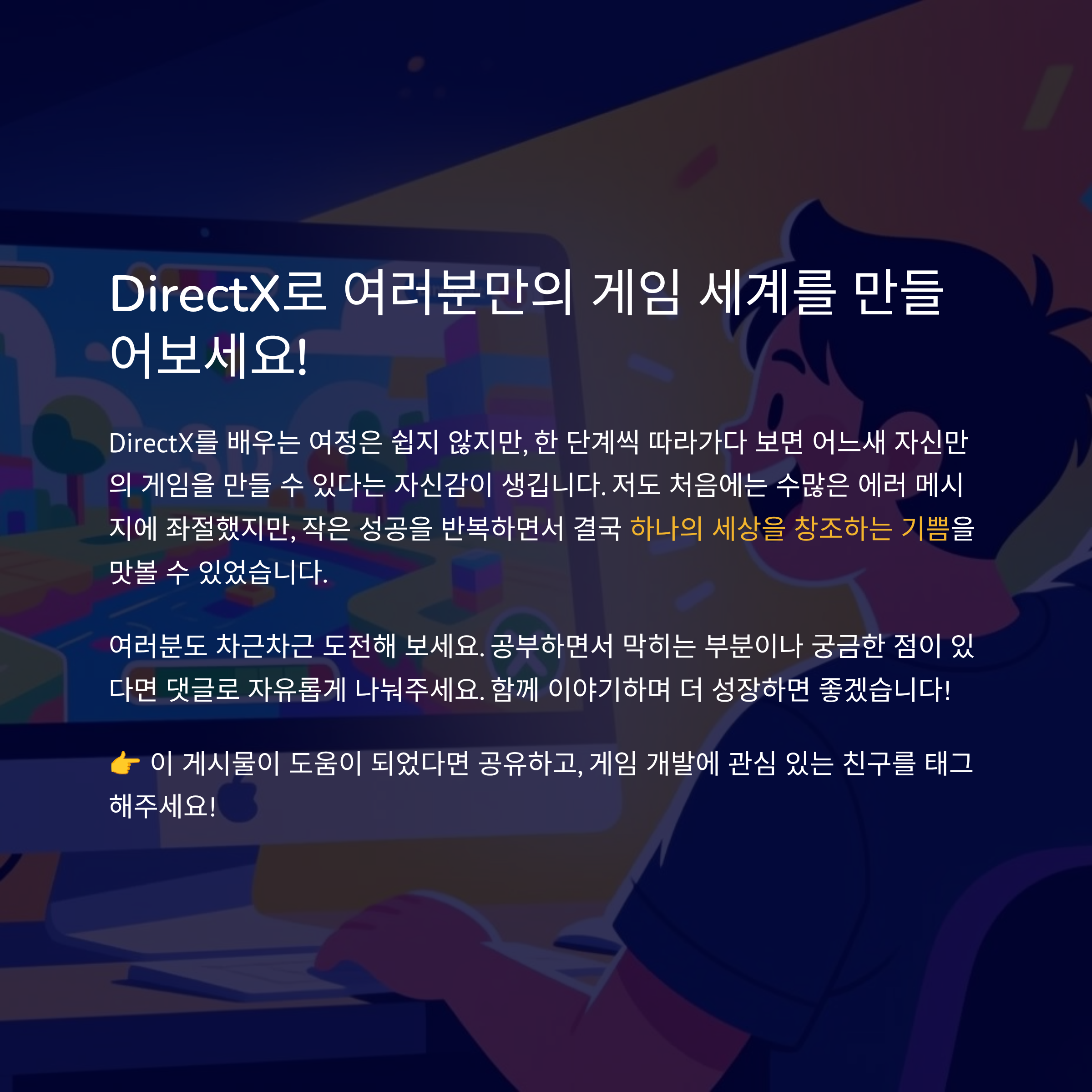 게임 개발이 어렵게 느껴지셨나요? DirectX 튜토리얼을 따라가다 보면, 어느새 여러분도 3D 세계를 창조하는 개발자가 될 수 있습니다!