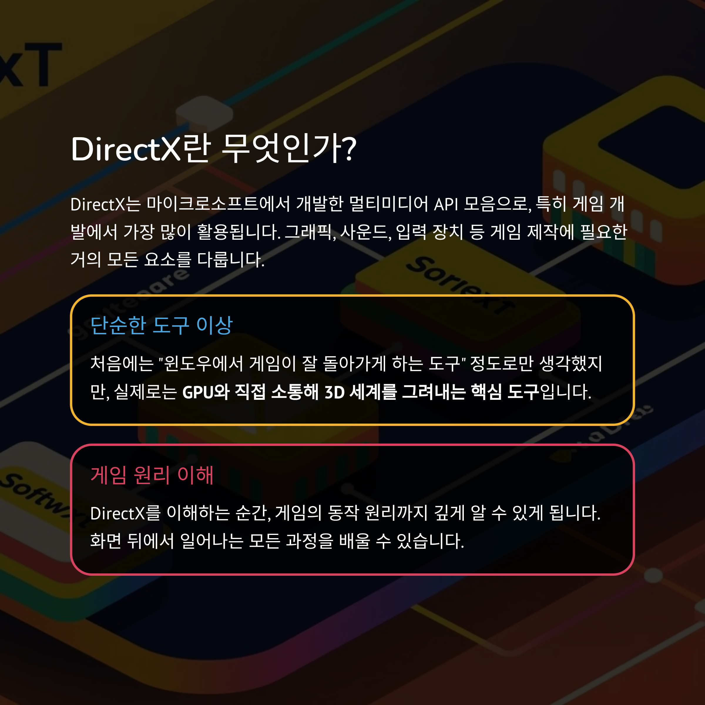 DirectX는 마이크로소프트에서 개발한 멀티미디어 API 모음으로, 특히 게임 개발에서 가장 많이 활용됩니다. 그래픽, 사운드, 입력 장치 등 게임 제작에 필요한 거의 모든 요소를 다루죠. 제가 처음 DirectX를 접했을 때는 단순히 "윈도우에서 게임이 잘 돌아가게 하는 도구" 정도로만 생각했어요. 하지만 배우다 보니 GPU와 직접 소통해 3D 세계를 그려내는 핵심 도구라는 걸 깨달았습니다. DirectX를 이해하는 순간, 게임의 동작 원리까지 깊게 알 수 있게 됩니다.